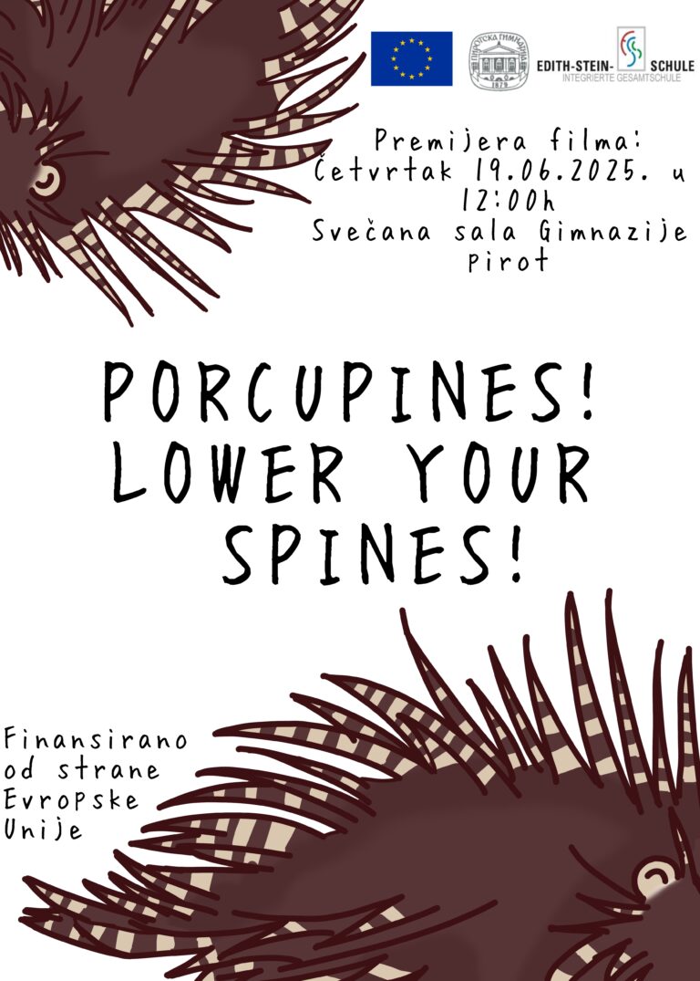 Pozivamo Vas da, u četvrtak 19.06.2025. u 12 h u Svečanoj sali Gimnazije Pirot prisustvujete promociji priručnika za snimanje fIlmova namenjenog srednjoškolcima “Rečnik s(v)eta”i učeničkog filma “PORCUPINES! LOWER YOUR SPINES!”, izradjenih u okviru projekta “CONFIL – Connecting cultures through film”, finansiranog od strane EU u okviru programa Erasmus+.
